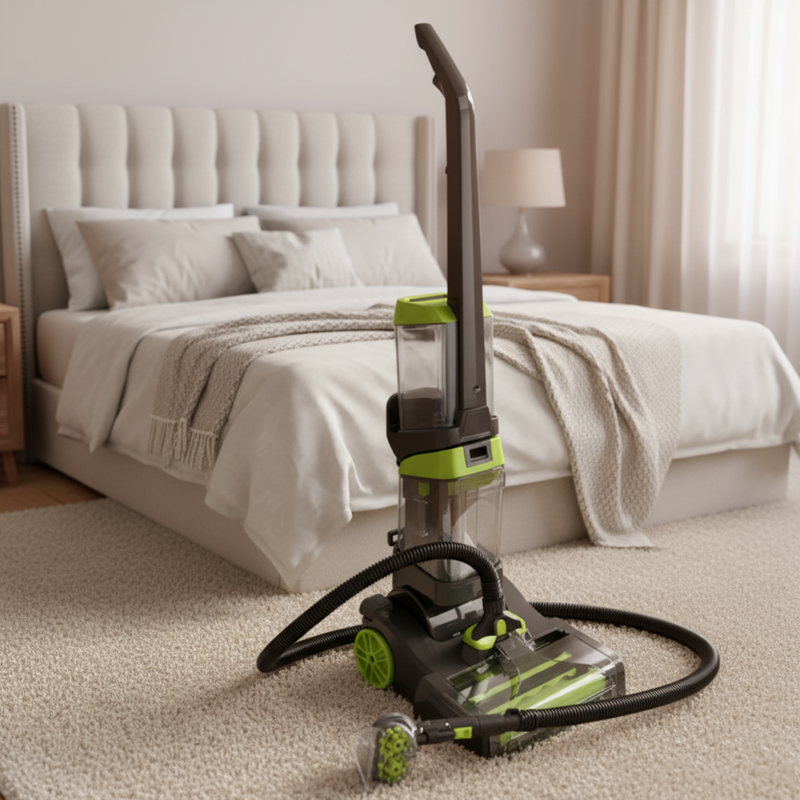 此为一款手持地毯清洗机,地毯和硬地板二合一使用,双水箱设计(可拆卸)、静音设计。配备内置加热器、双旋转洗刷、风动刷软管、可拆卸滚轮地板刷。并且拥有离合功能,能够有效的减少地刷对地毯造成的过渡磨损。