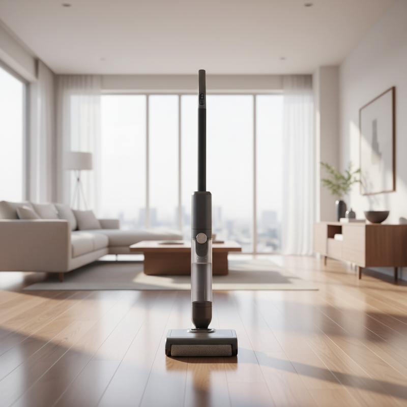 此为一款智能扫拖洗地一体机,拥有自带牵引功能、自主清洗功能、自动喷水功能。采用固液废物分类系统、减震降噪技术、清污分流设计、无线手持设计、直立放置设计,配备独立高扭矩马达、卡扣式水箱、聚合物清洗刷、防溅收纳底座,打造美好清洁的家务体验。